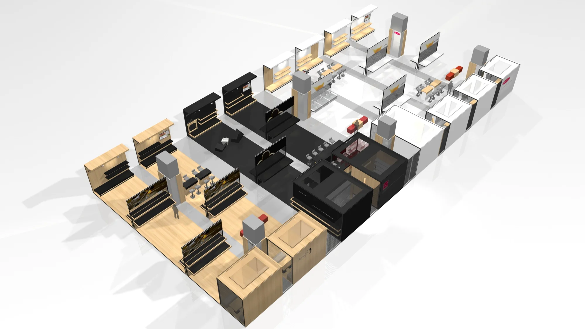 The stand area is divided into 3 parts according to the brand identities. The same structure is used for central and wall display units, but differentiation is achieved through their different visual identities and materials. This enabled us to both ensure a common look and feel across the whole stand and also communicate brands’ unique identities separately to the visitors.